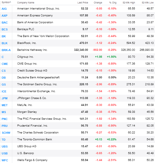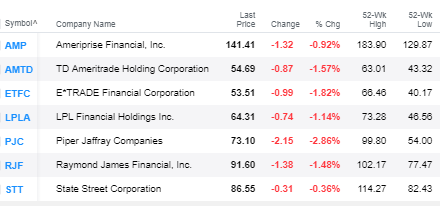 Biggest Losers: PIper Jaffray (- 2.8%), Wells Fargo (- 2.5%), ICE (- 1.9%), E*Trade (- 1.8%)